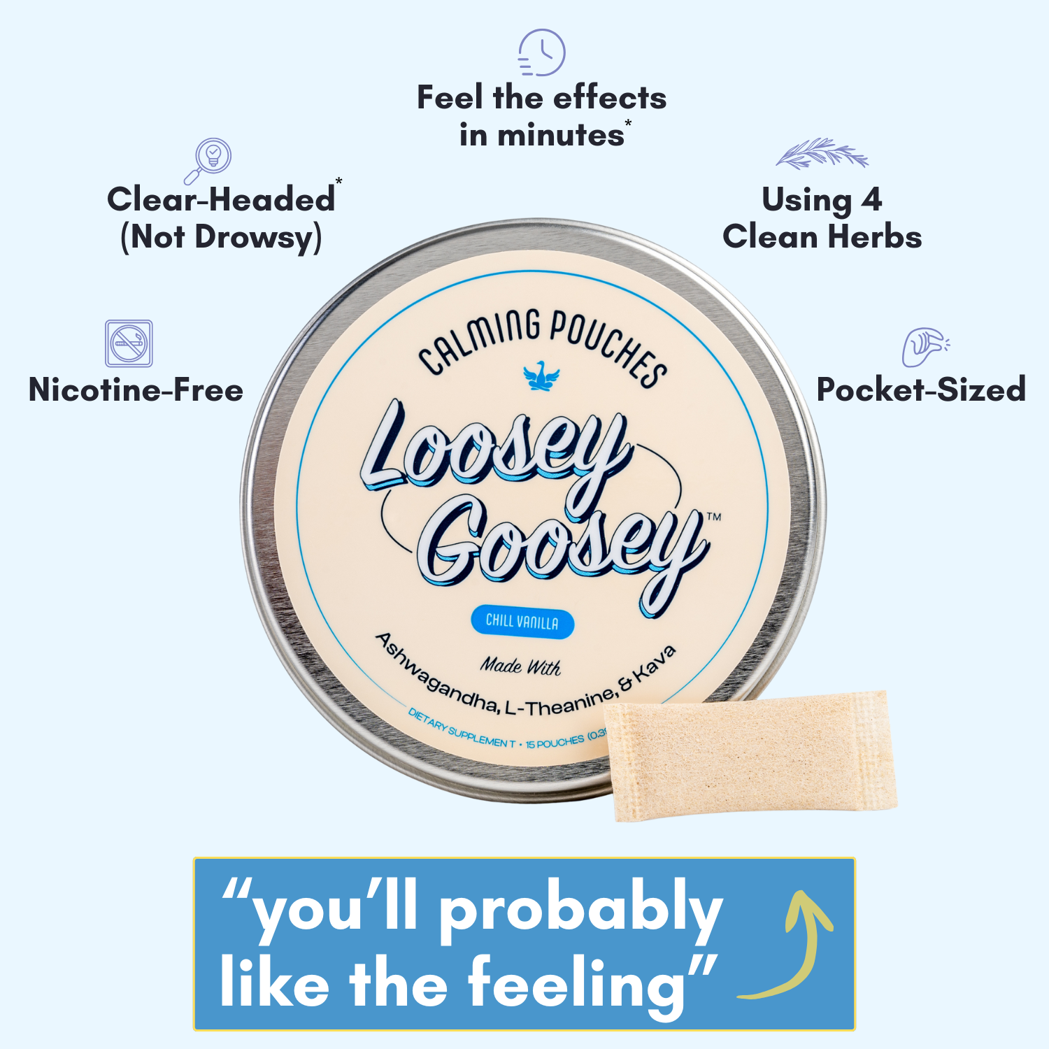 A noticeable, yet not overwhelming effect that helps quiet the mind and create calm. Unlike psychoactive substances, which may overtake your senses, Loosey Goosey provides a subtle calm that adapts to your moment—whether for focus or unwinding. You’ll feel a gentle tingle on your gum as the formula absorbs in seconds, signaling that quick relaxation is underway.